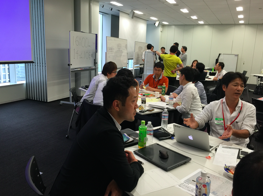 さて、チームビルディングも第一弾のライトなテーマのワークで達成、本題の戦略の策定に入ります。ここからが本番です。熱い議論がかわされています。
