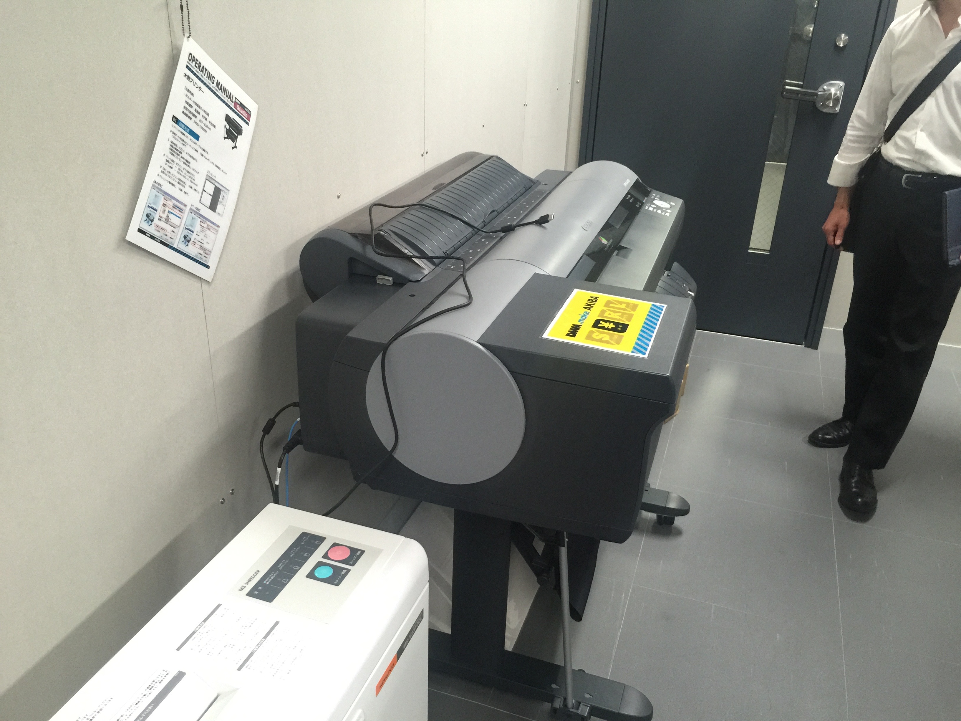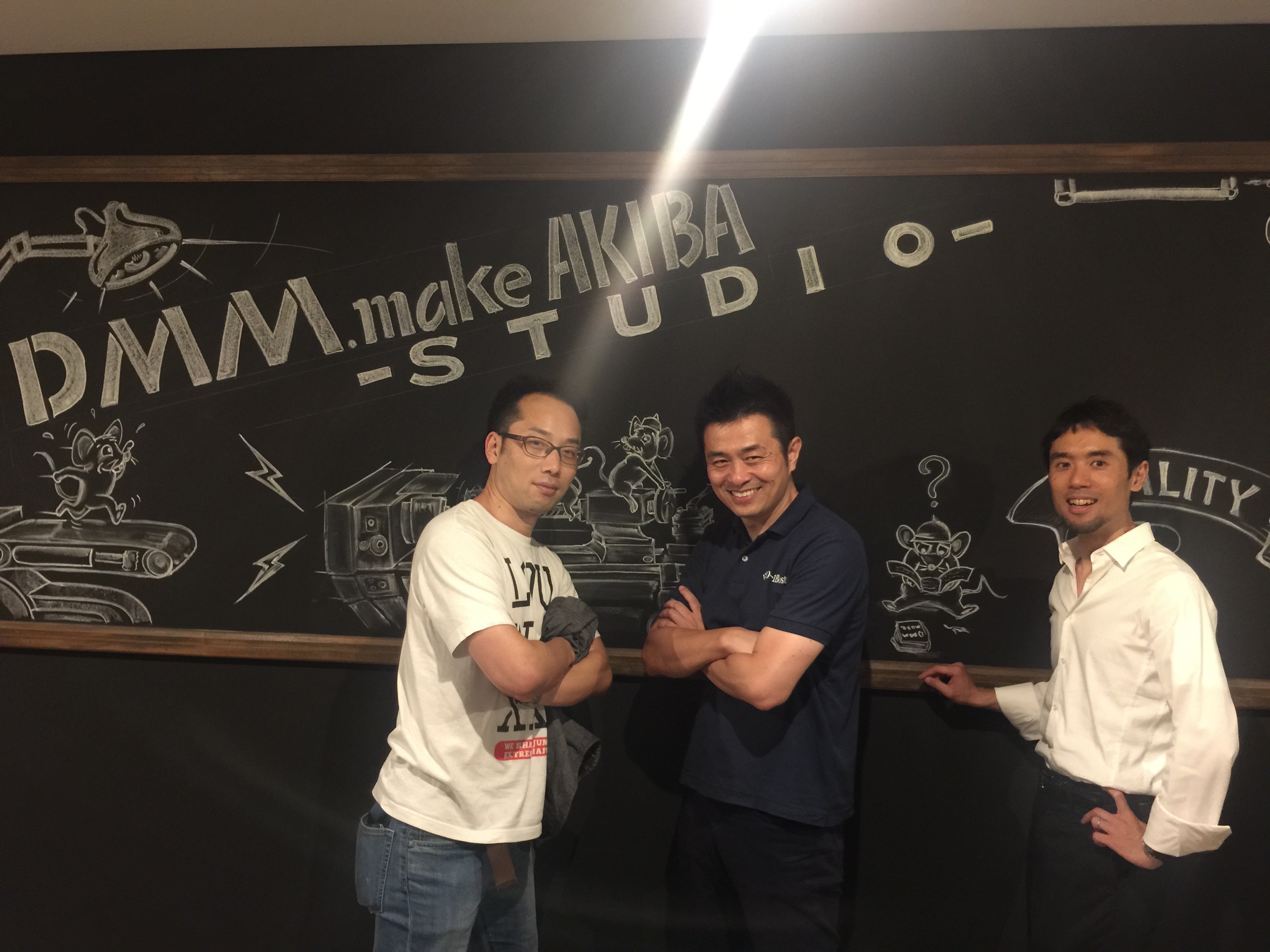 さて、そんな中、皆さまのお計らいでDMM.makeを見学させていただく機会に恵まれましたので、行ってまいりました。まずはお上りさん的に集合写真を(左上海の山本さん、右経営大学院の山中先生)。