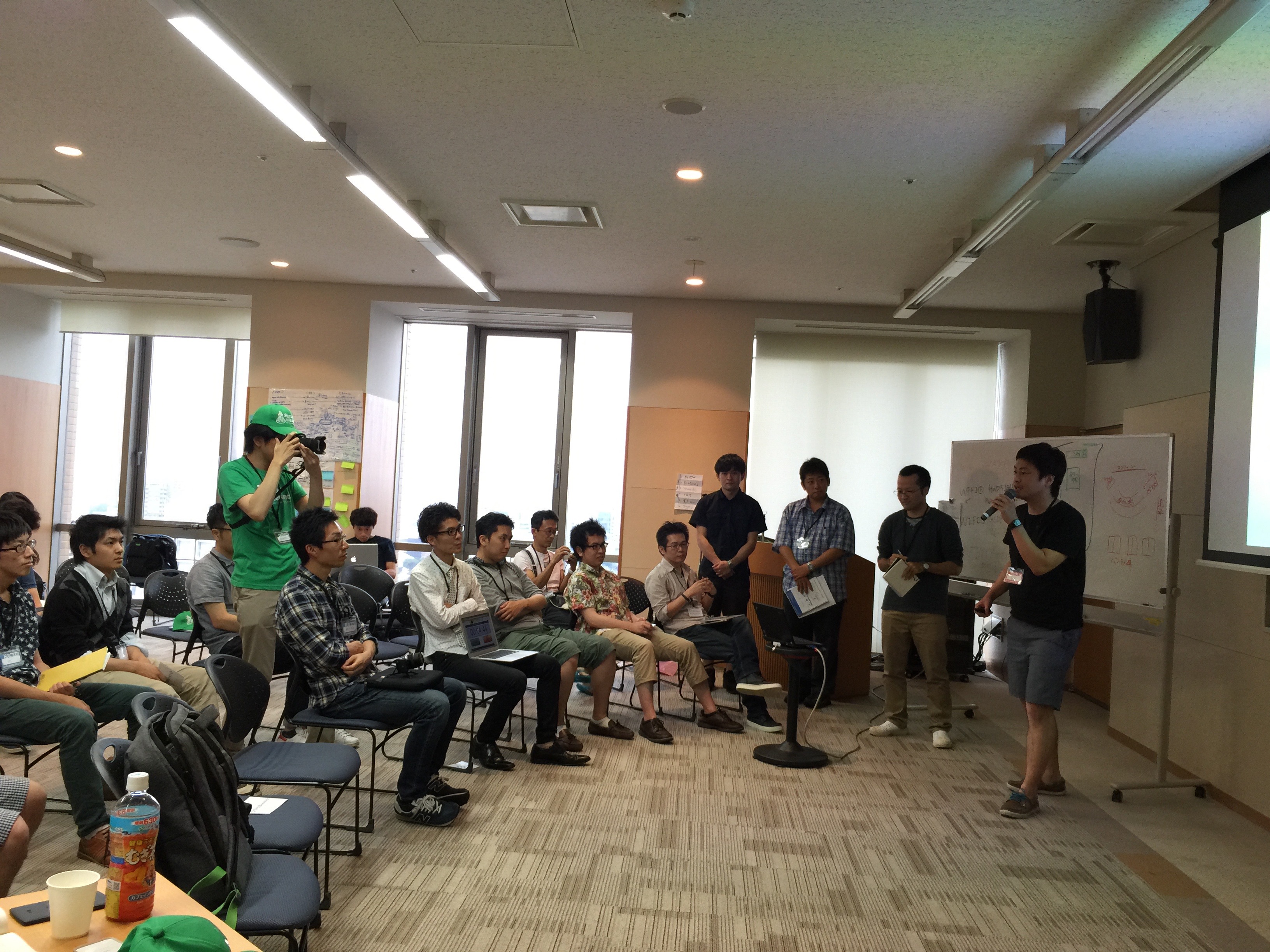最初にアイデアを持ってきた人が1分ピッチして、投票(今回の名古屋では21名がピッチ)。もう一回再度絞り込んで10名でピッチして、チームビルドします。アドバイスをするコーチが5名(今回は参加30名で6チーム)居ました。外部から人を引っ張ってきてもOKですし、オフショアを使うような場合もあり得ます。