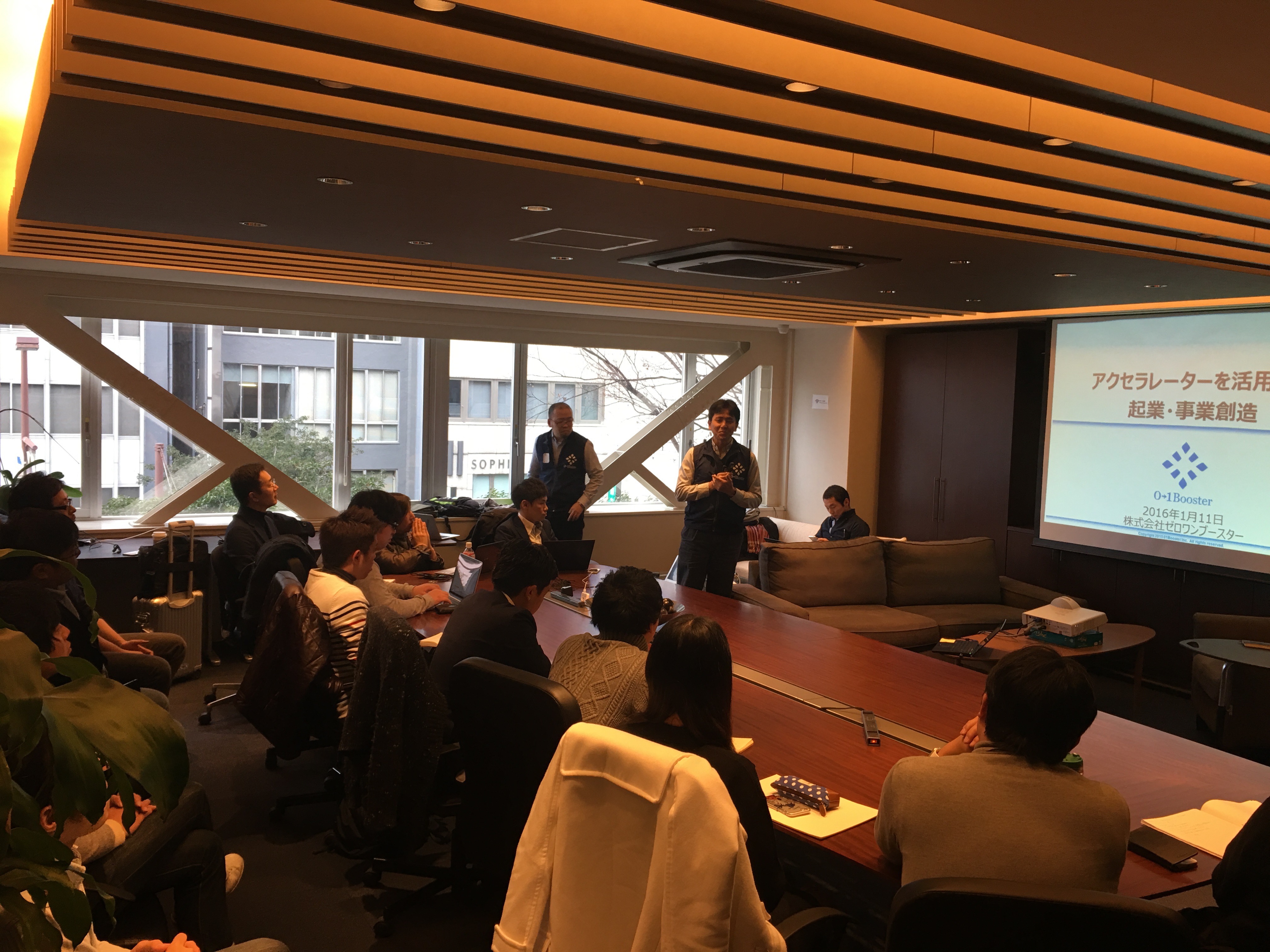 OnRampはドーガンさん他が運営されているインキュベーションオフィスです。地下鉄の赤坂駅近くにあります。1/11の昼に事前セミナーを実施しました。学生さんを含め、様々な参加者に集まって頂けました。オーラ鈴木から01Boosterの実施しているアクセラレーターの説明も実施しました。一般的にはどちらかというと起業初心者をサポートする「教育型の起業プログラム」と既に事業を実施しているベンチャー企業を対象とした「アクセラレーションプログラム」がありますが、今回のSD2016はこの前半寄りで8:2ぐらいのイメージとなります。