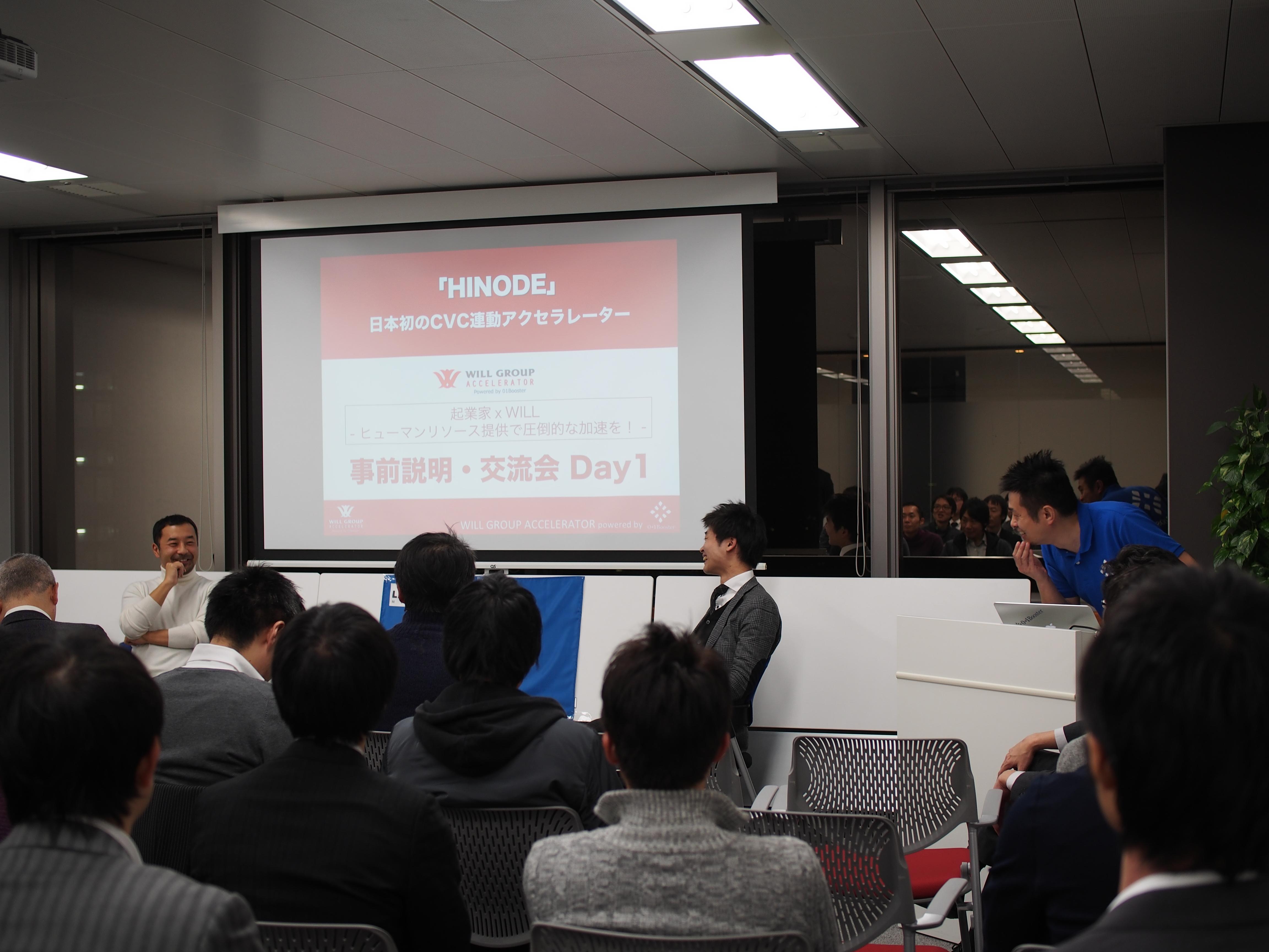 ウィルグループアクセラレーター「HINODE」。コーポレートベンチャーキャピタル(CVC)連動でスタートアップ・ベンチャーにとって重要な人材の支援をも視野に入れた日本でも最も進んだコーポレートアクセラレーター(注1)です。今回は事前説明会のDay1を2016年1月15日に実施しましたのでご報告します。事前説明会のDay2は1月29日です。是非、こちらからお申込下さい。ビジネスプランの募集も開始しております。リリースはこちらを。