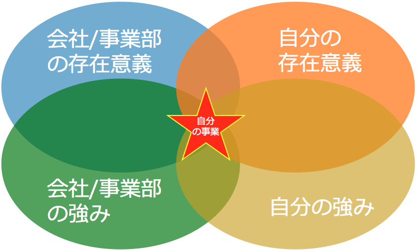 特に存在意義(ビジョン)的な抽象概念を考えることに日系は慣れていません。欧米系が強い分野です(ダイアモンドの記事)。この会社・自分の存在意義、どんな世界を創りたいのか、会社と自分の強みを把握し、交点である「自分の事業」を把握すると、後々、何かを決める上での指針となります。