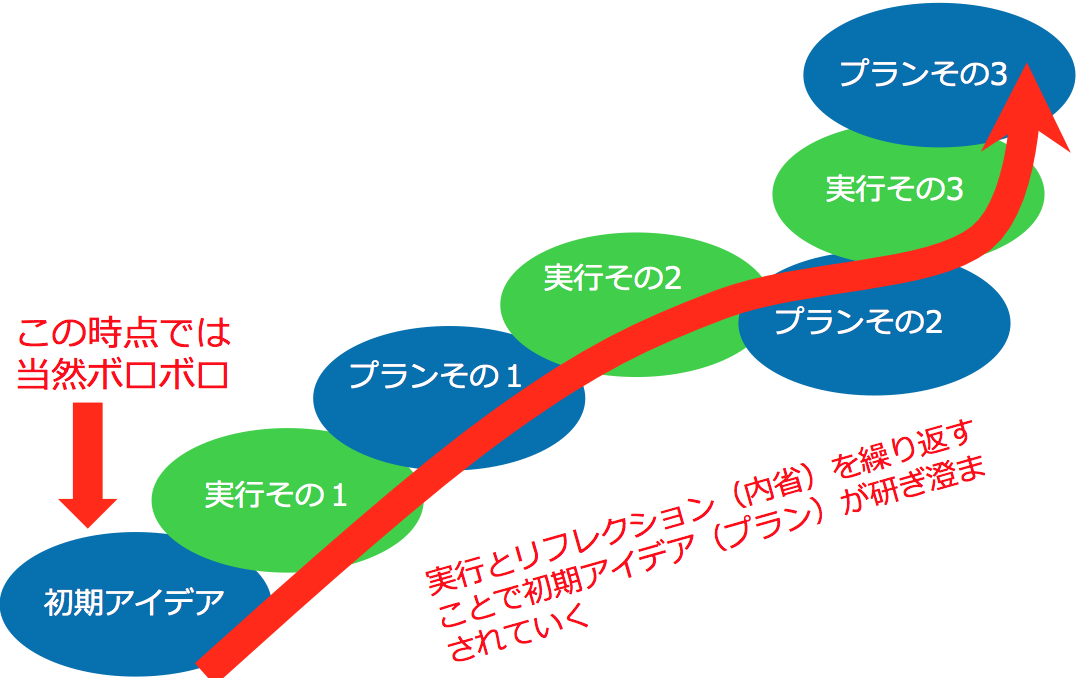 そもそもアイデア(ビジネスモデル)は組み合わせに過ぎません。この点は、インプットの量に比例するので、過去にビジネスモデルを散々聞いたり、調べたりしている人ではなければ、自分で一から考えるのはちょっと難しい(効率が悪い)と思えます。他国、他市場、自市場、歴史的、海外のスタートアップのビジネスモデルなど様々なリファレンスがあります。これらをよく見てみてはいかがでしょうか。また、事業を進めるにあたって、初動をどうするか?広報をどうするか?なども類似事例が参考になります。是非、周りから、歴史から、学ぶという方向性を持つと効率的であると思います。下図のように初期アイデア(ビジネスモデル)はどこまで行っても机上の空論ですので、市場でのテストを実施して磨き上げる必要があります。初期アイデアをじっくり考えるのもいいところ1-3ヶ月もあれば十分では?と思います。何故なら「ほぼ失敗」するのですから。実験と思えば楽です。一回で、製品の条件出しができると思っている人は居ないでしょう。幾つかの条件を試してみるはずです。