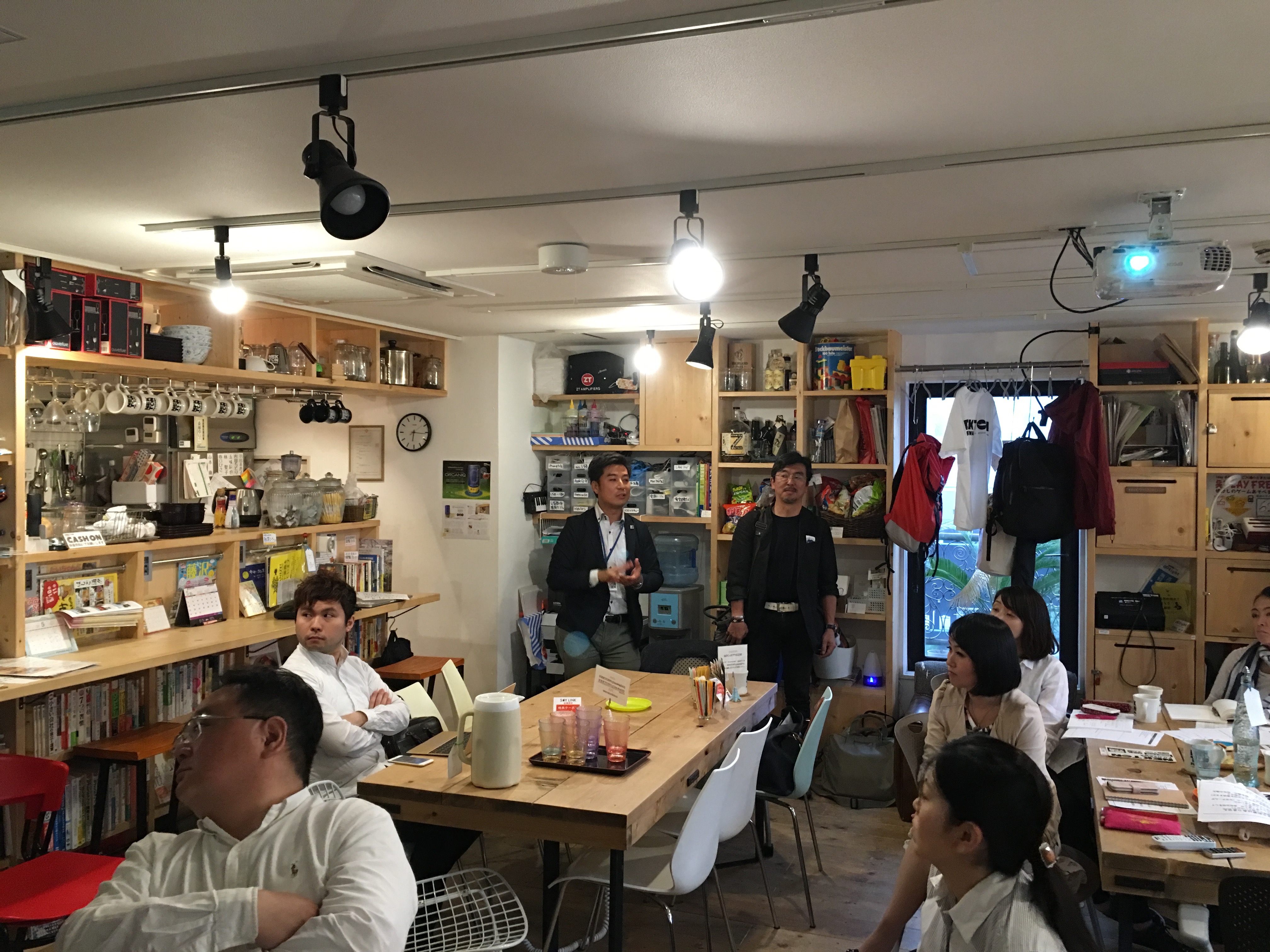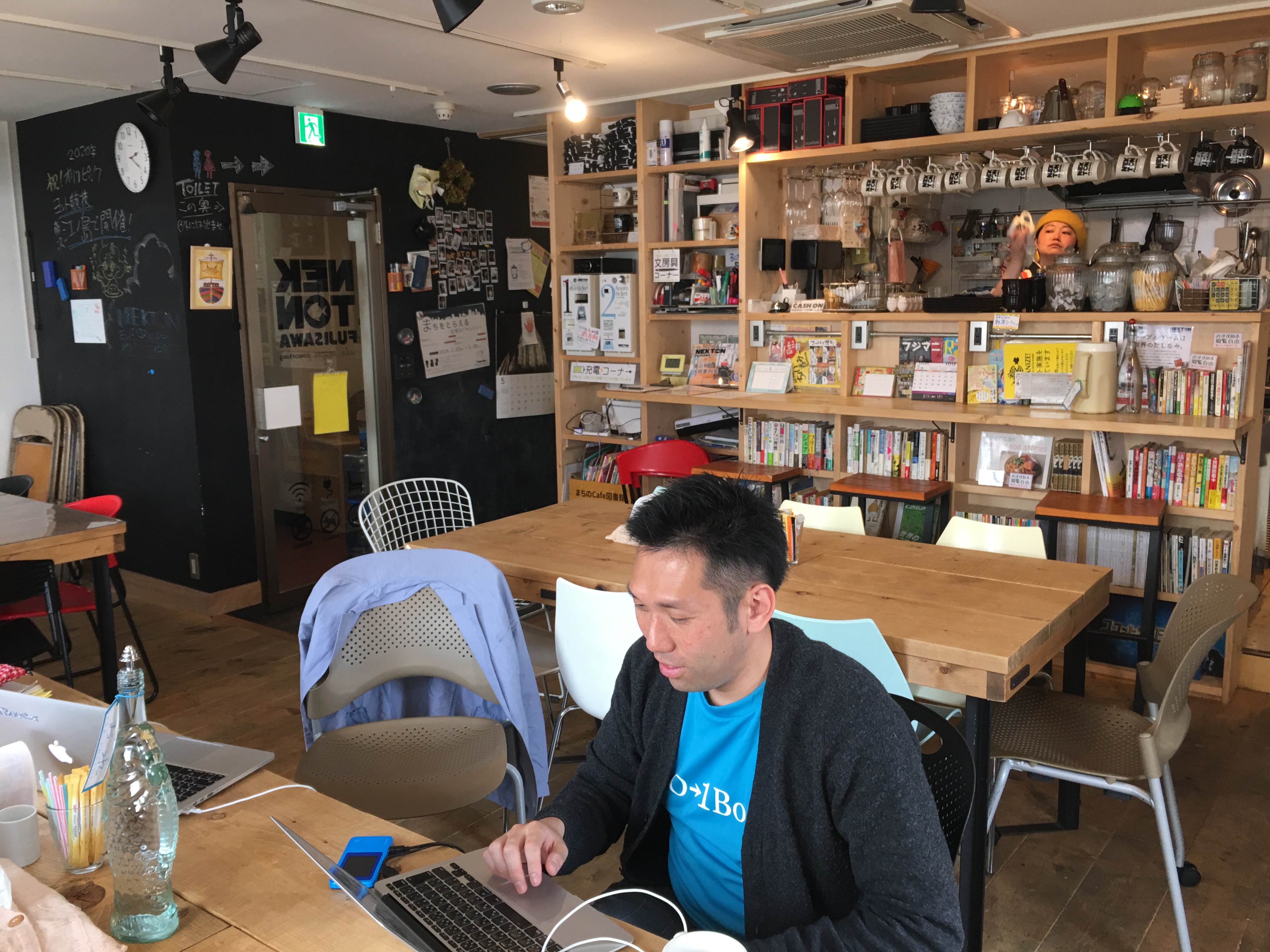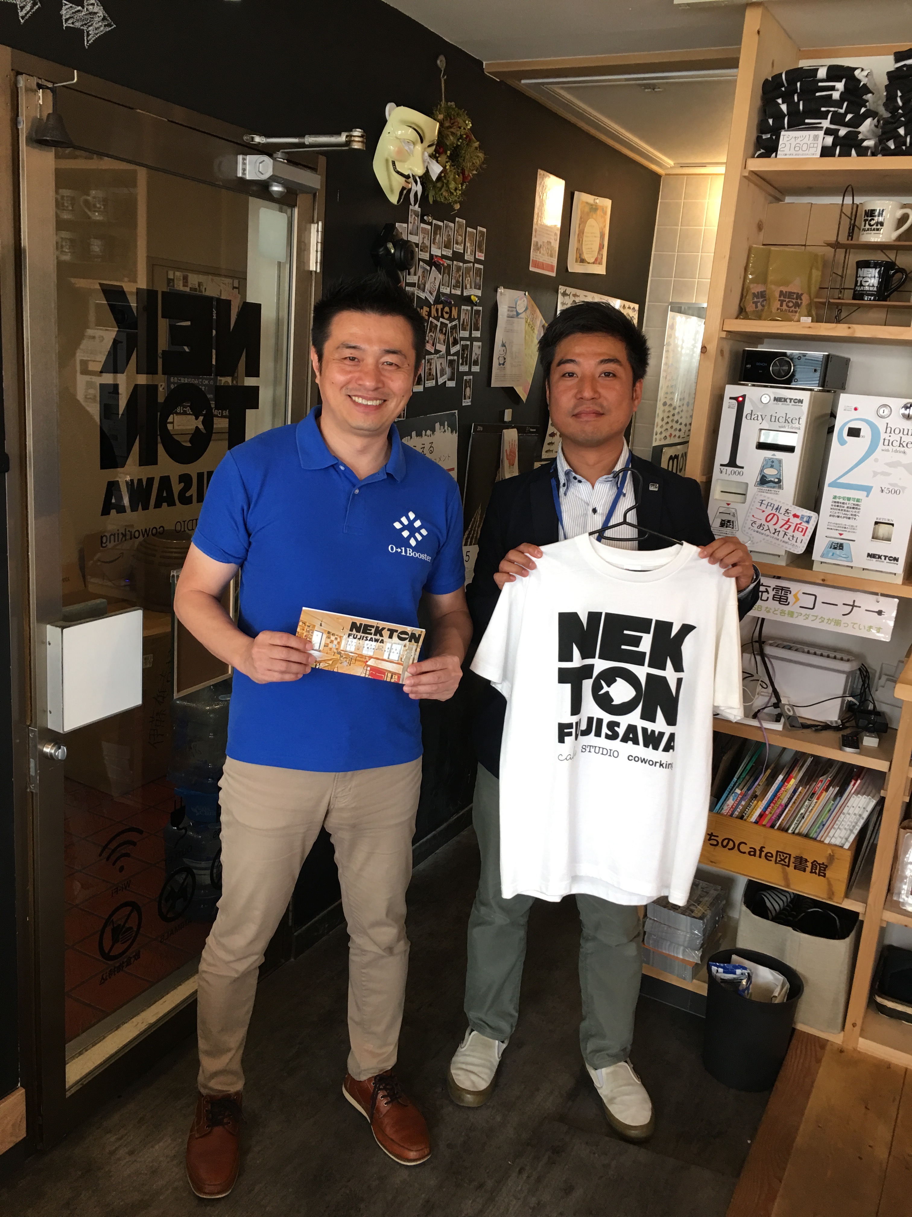 NEKTON FUJISAWAさんのご厚意で2016年の5月8日にショートアイデアソンとビジネスプランのブラッシュアップ会を実施しました。まずはNEKTONの三浦さんとTシャツを一緒に。超イケているスペースです。