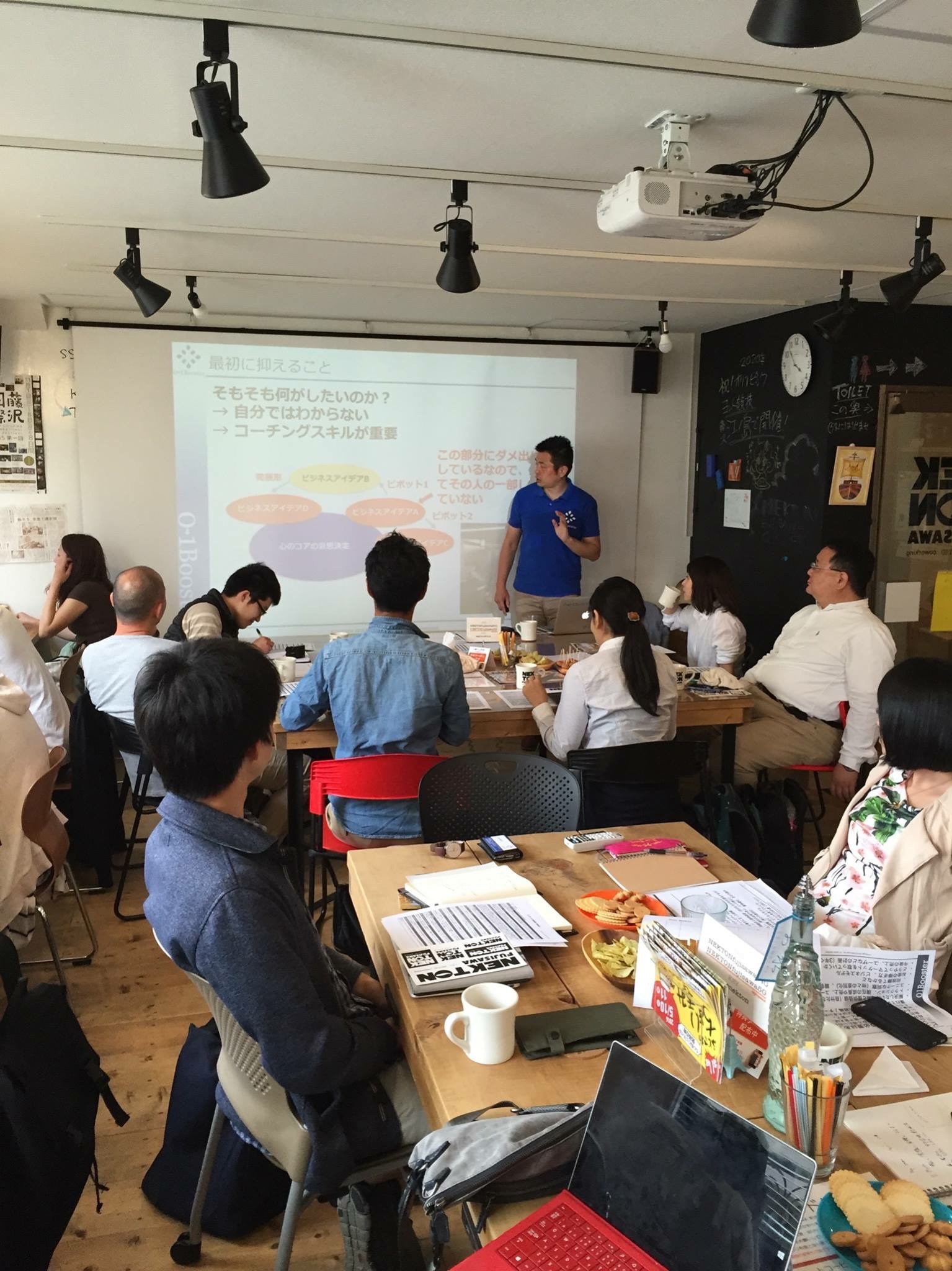 その後は、ビジネスプランを持っている6名に関して、3−4名のチームでビジネスモデルの各要素に従ってFeedbackを実施しました。今回はプランの有無に関わらず「メンタリング」を重視した構成で進めました。一通り、ブラッシュアップを実施したピッチ大会を実施した後に、最後は代表の三浦さんのご挨拶です。藤沢の起業の発信地にされたいのとのこと。素晴らしいですね!