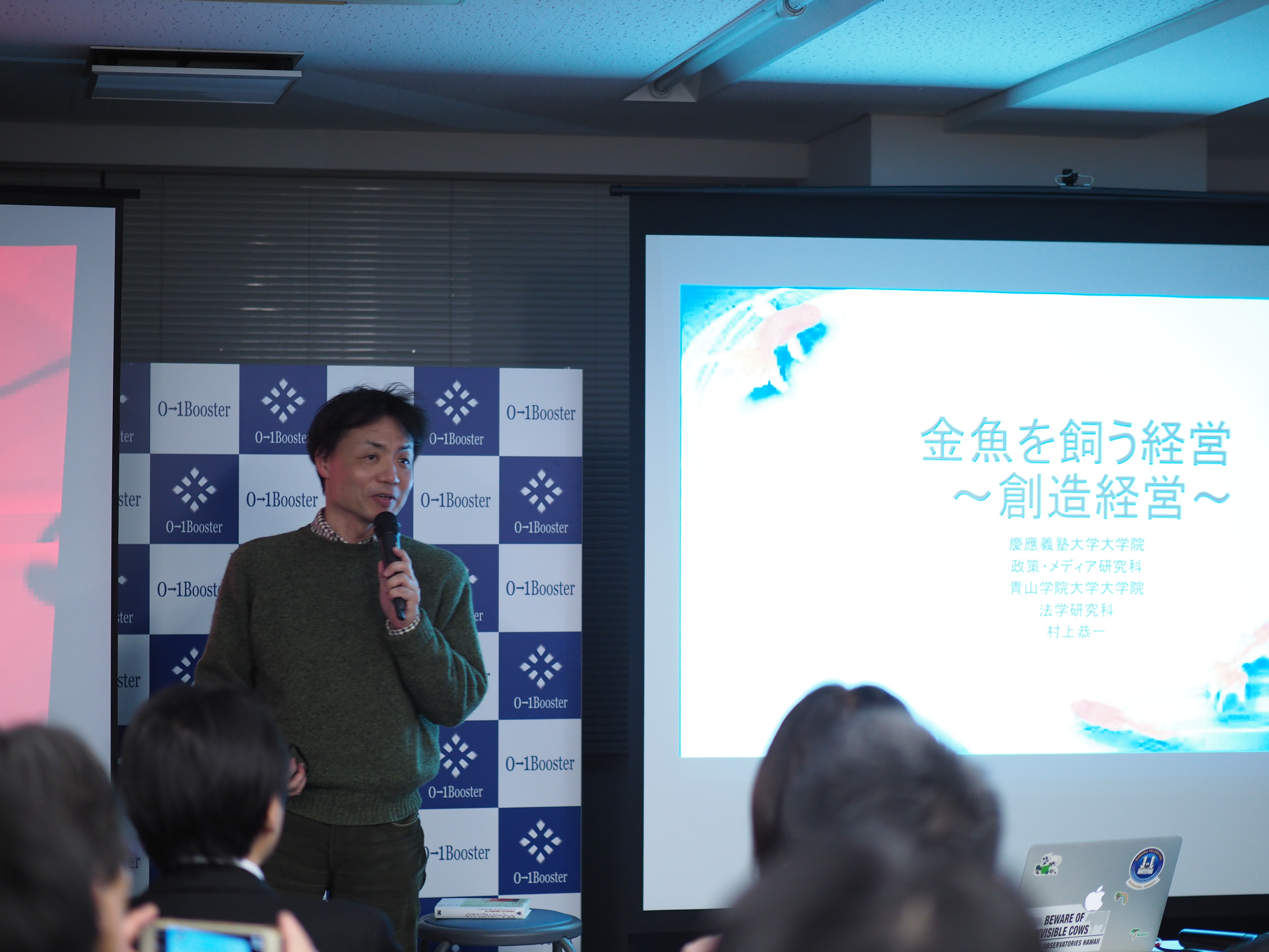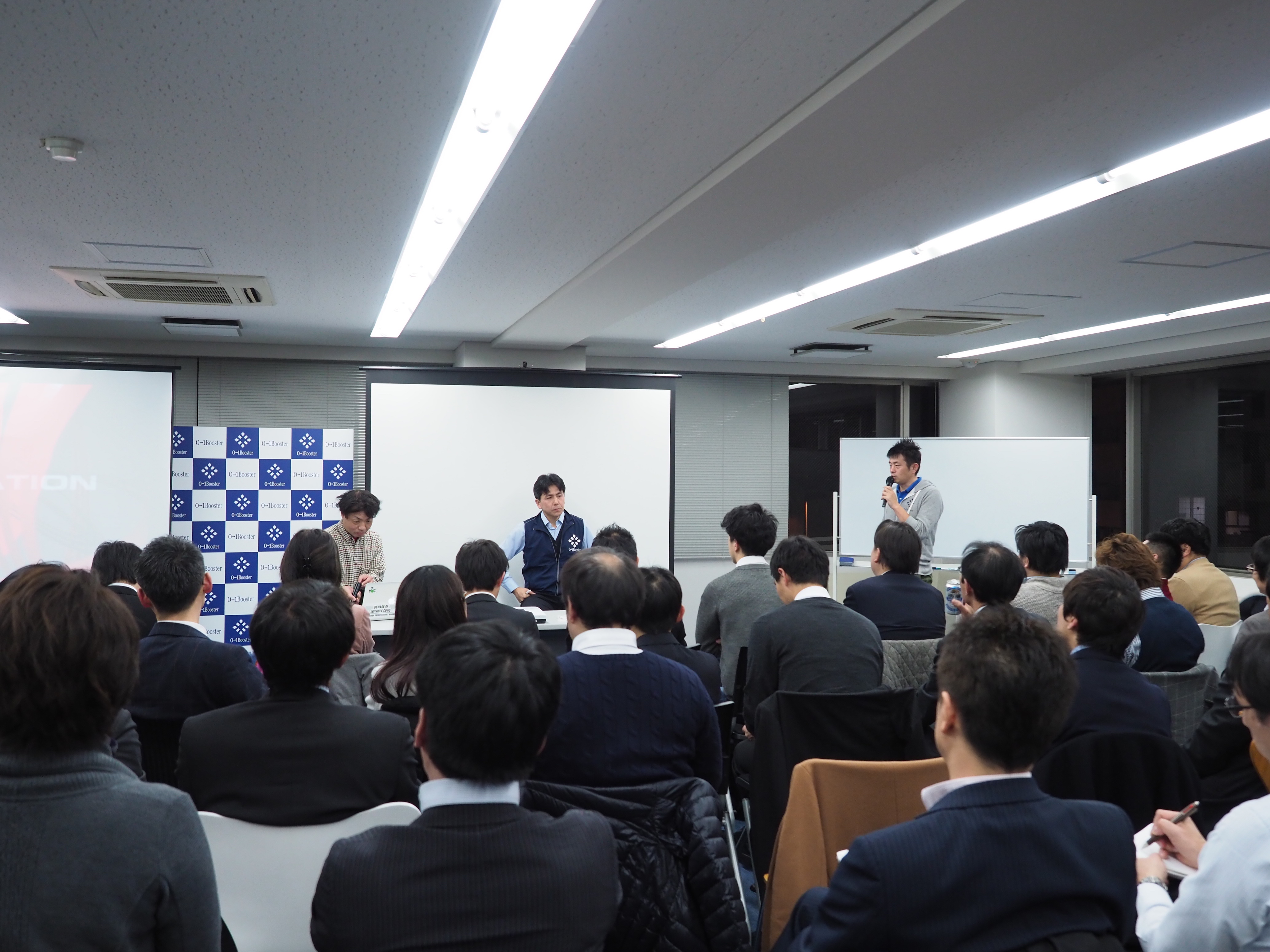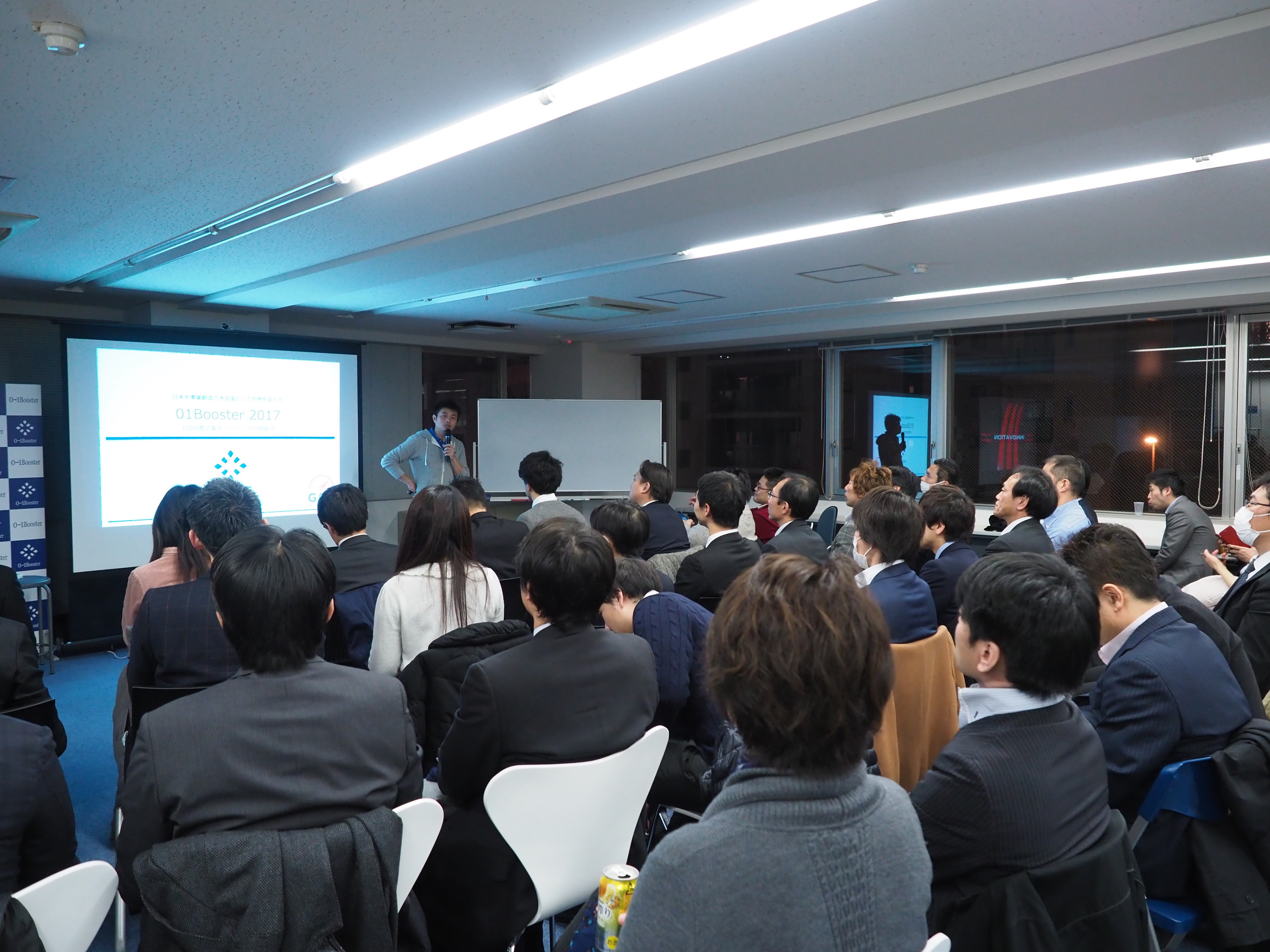 この日も開場と同時に、会場の至る所でネットワーキングが開始されます。01Booster共同代表の合田ジョージによると「アメリカなど事業創造が強いところは何処もこのスタイルをとっている。一番重要なのはコミュニティであって、人のネットワークそのものに価値がある。それを作りたいので、このスタイルにさせていただいている」とのこと。その後、セミナーパートへと移っていきます。
