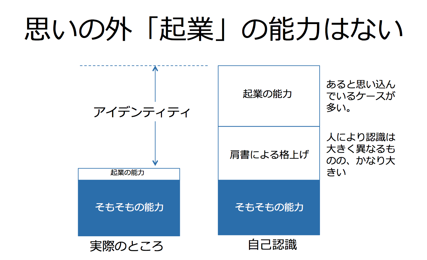 そこで、過去の経歴に頼るというのもありますけど、これも良し悪しで、なんというか、そこに引っ張られます。結局、それを超えられていないケースをたまに散見します。「肩書き捨てたら地獄だった - 挫折した元官僚が教える「頼れない」時代の働き方」にもありますが、下図のイメージかと。ゼロイチの能力(イノベーション型事業を立ち上げる上で必要な能力)は思いの外無いのと、では、ダメなのか?というと、そもそもの能力(自分の強み)を自分で把握できていないケースも多く、なかなかしんどい時を過ごすわけです。この自己認識と実際のところの差が「アイデンティティ」としてカオス(起業の「カオス」は最悪で最高の人生の夏休み)のときには重く心にのしかかるわけです。