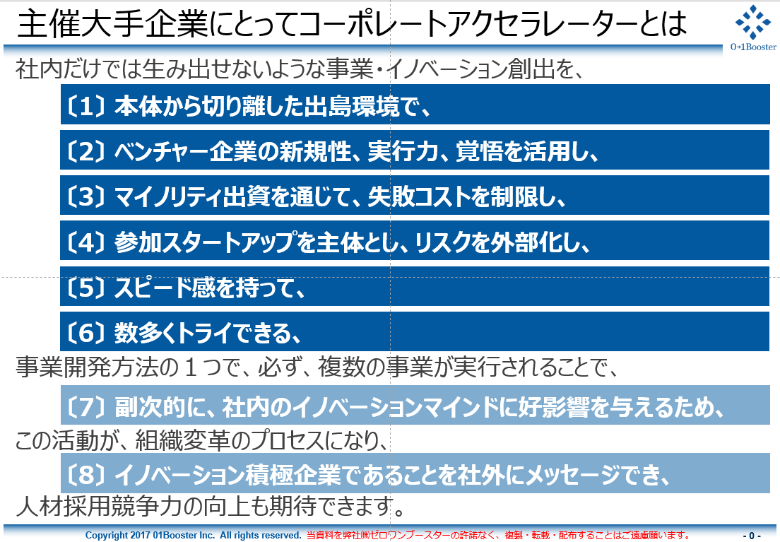 弊社01Boosterでは、大手企業が主催するコーポレートアクセラレーターを以下のように定義づけ、拙著「コーポレートアクセラレーター」でも明示しております。